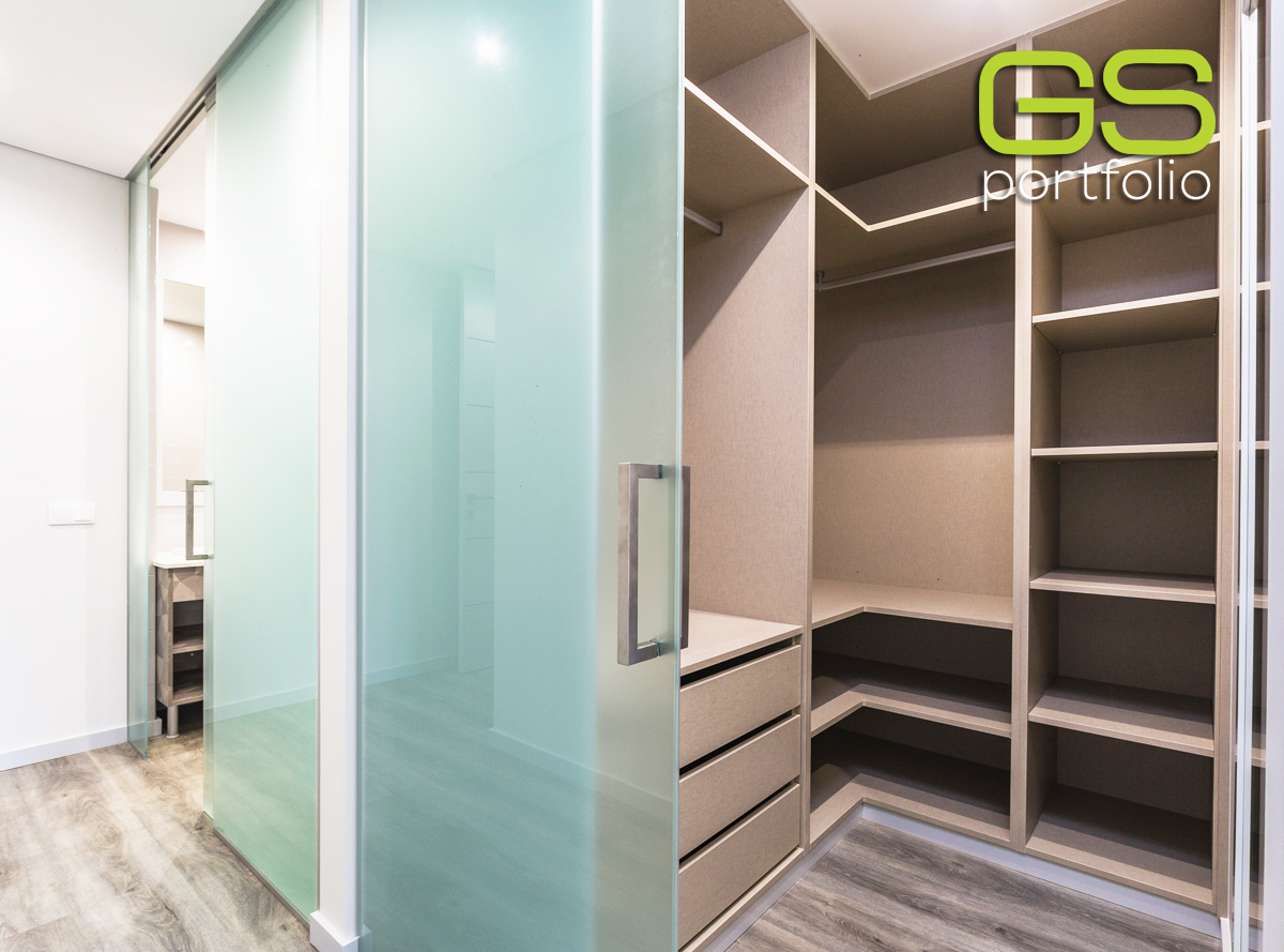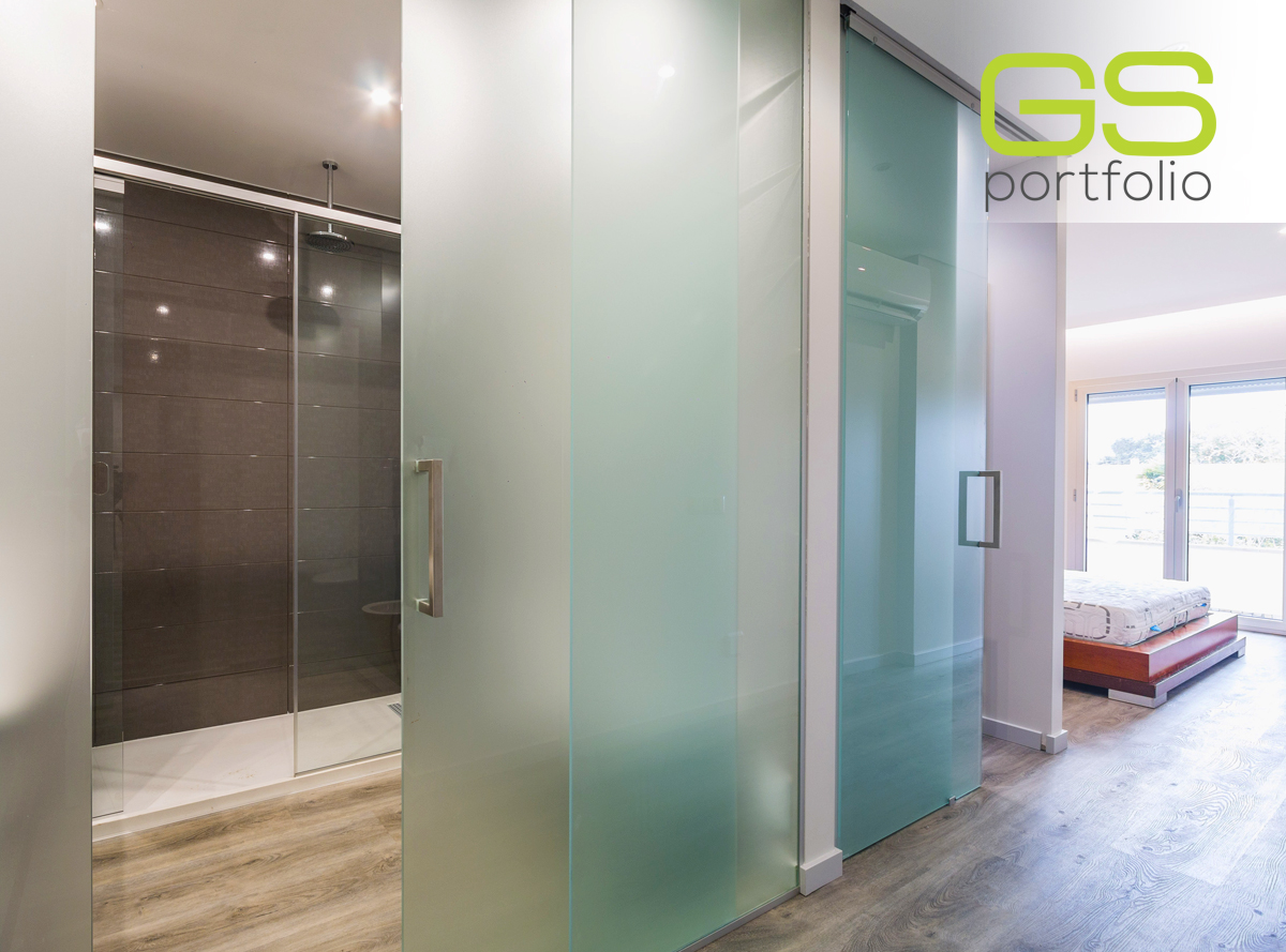 - INSIDE DV sliding door system by OPENSPACE with fixed frosted glass panel, combined with frosted glass sliding door!