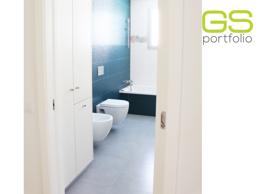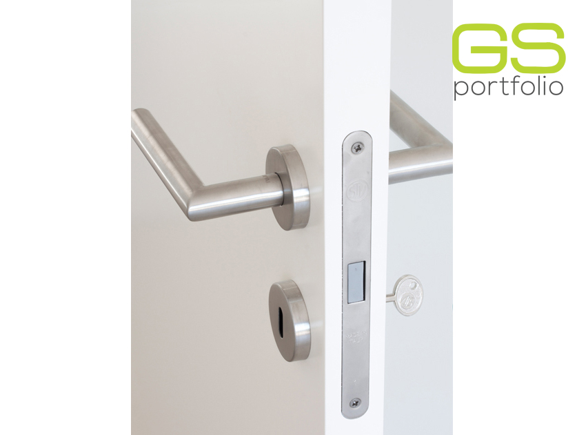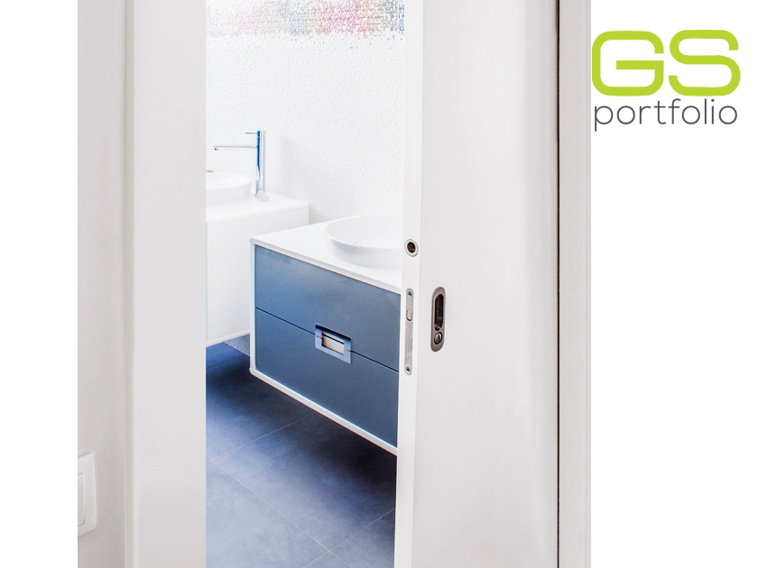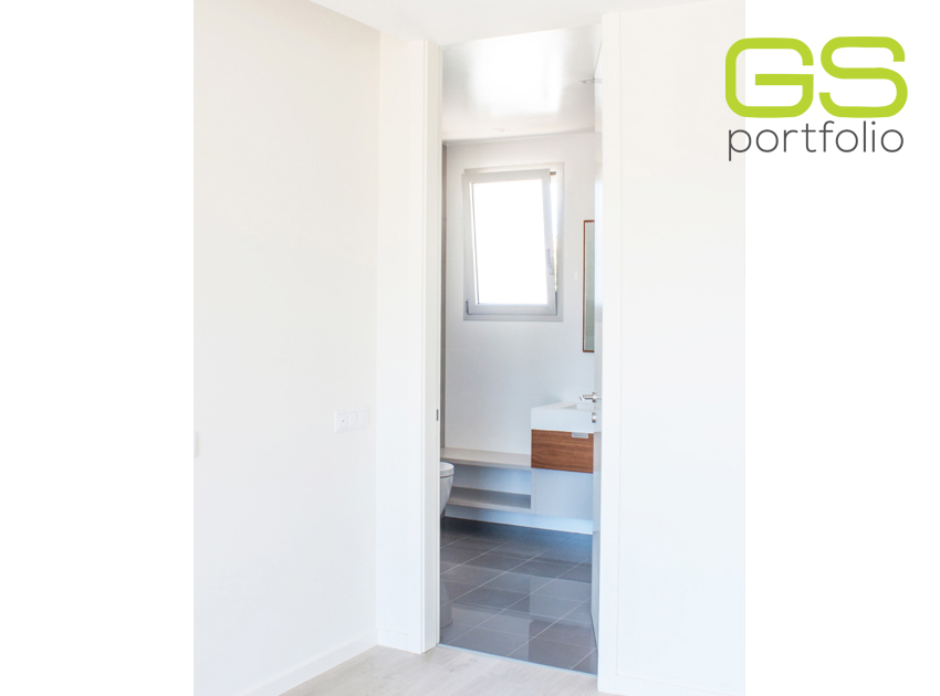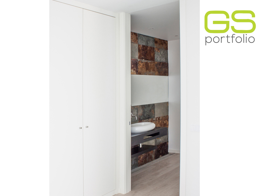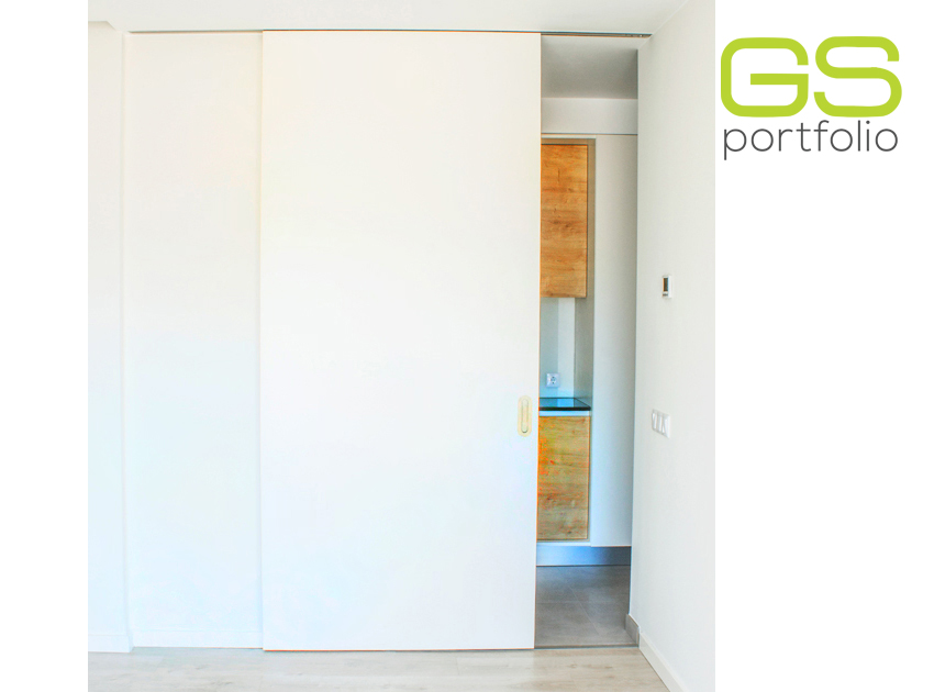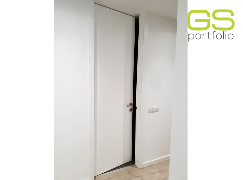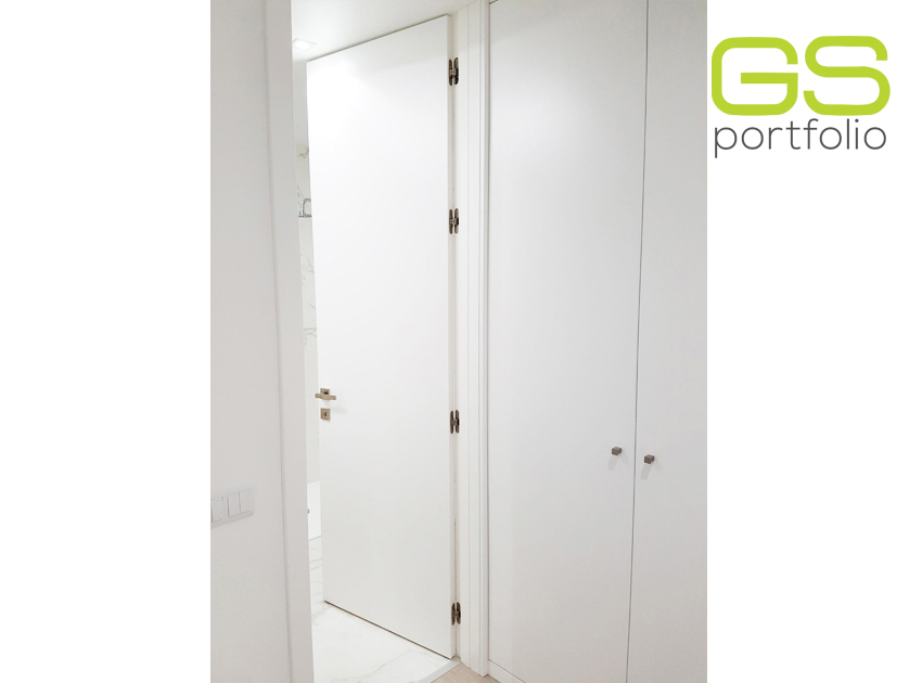 - Portes battantes GS DOORS laquées en blanc mat, modèle PLUS (jusqu'au plafond), avec charnières cachées et serrure magnétique.
