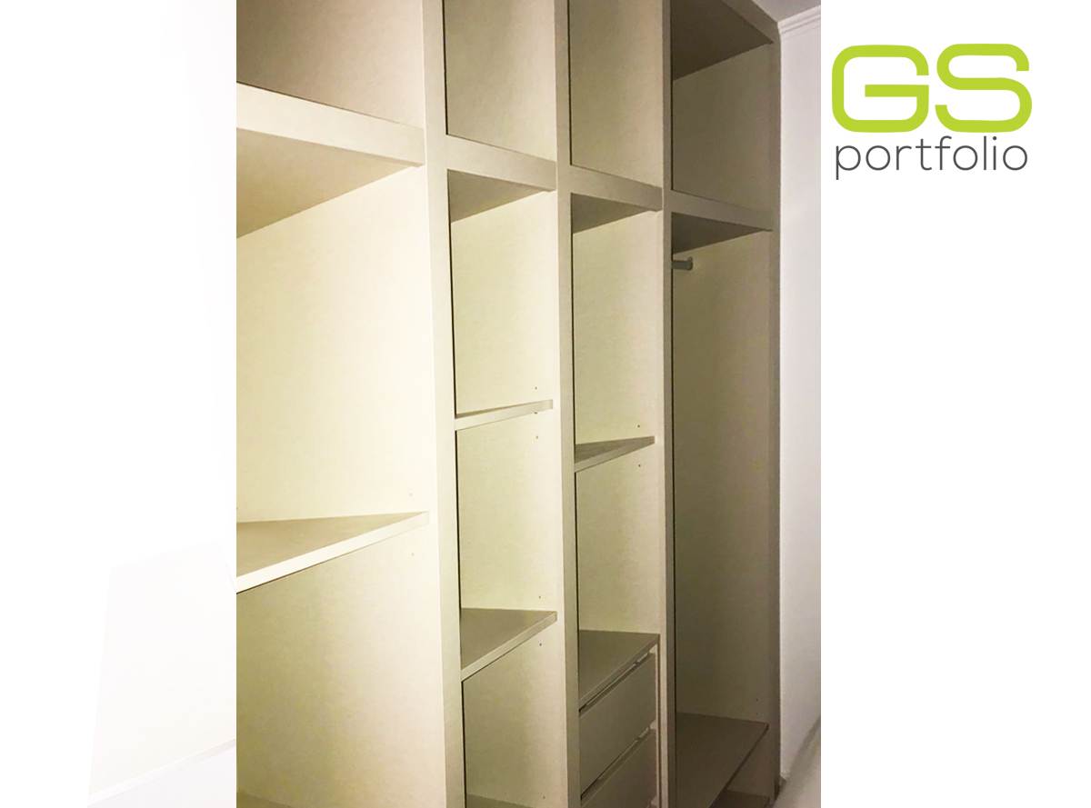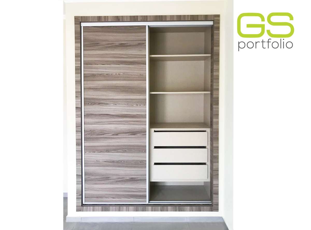 - Placard encastrée GS CONCEPT avec 2 portes coulissantes. Feuille de vinyle : Olmo Gris et profil latéral poignée en aluminium.