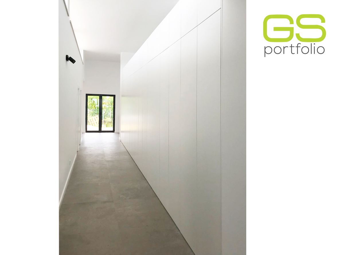 - GS CONCEPT built-in wardrobe with tic-tac opening system, with white mate lacquered doors. Developed along the entire hallway housing.
