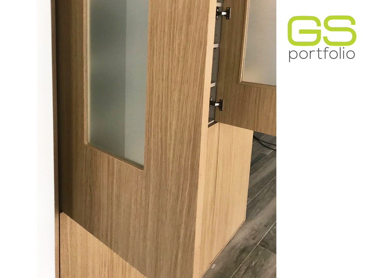- Armario a medida GS CONCEPT con 6 puertas batientes. Apertura de vidrio esmerilado. Acabado de lámina de vinilo: Roble natural.