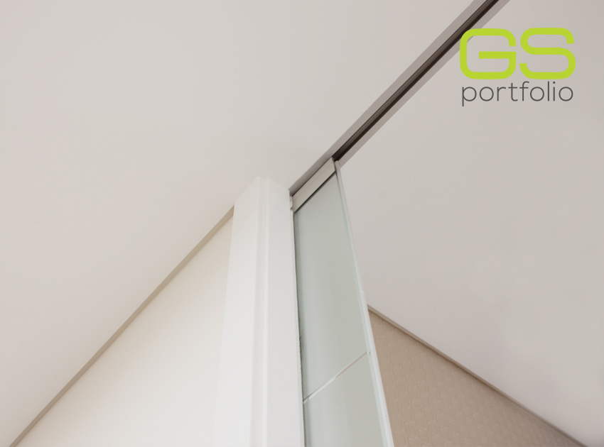 Caixilho UNICO PLUS com porta de vidro fosco com 5 rincões, com aro e guranição em madeira - lacado branco mate. Aplicação de asa. By OPENSPACE!