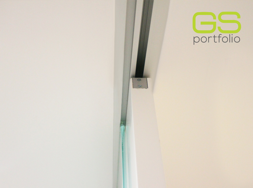 - Système de porte coulissante INSIDE by OPENSPACE avec porte laquée blanc mat avec coins. Conjugué avec un panneau en verre mat blanc fixe avec coins.