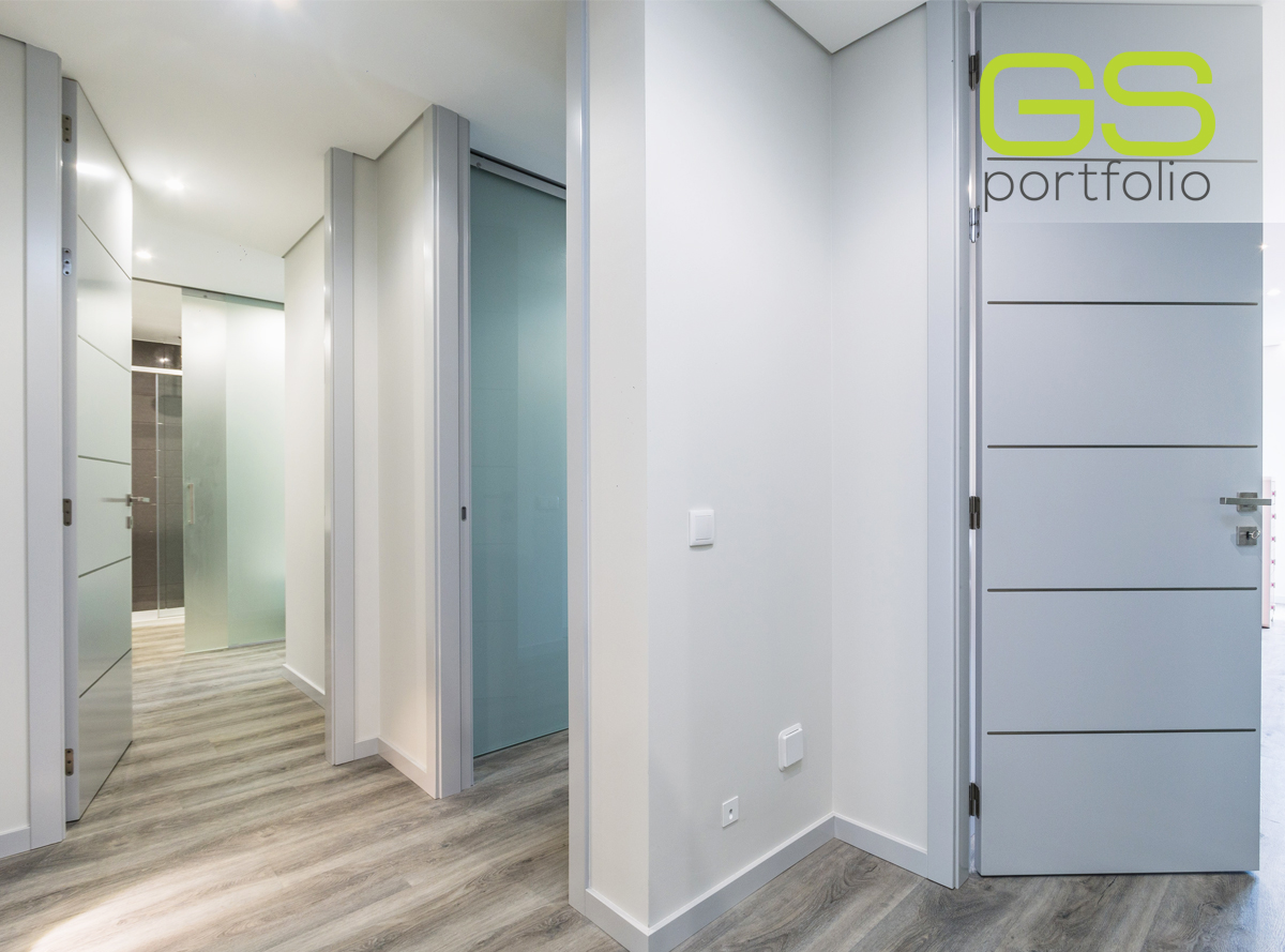 - Porte battante GS DOORS, modèle PLUS (jusqu'au plafond), en laqué blanc mat avec coins. Serrure magnétique.