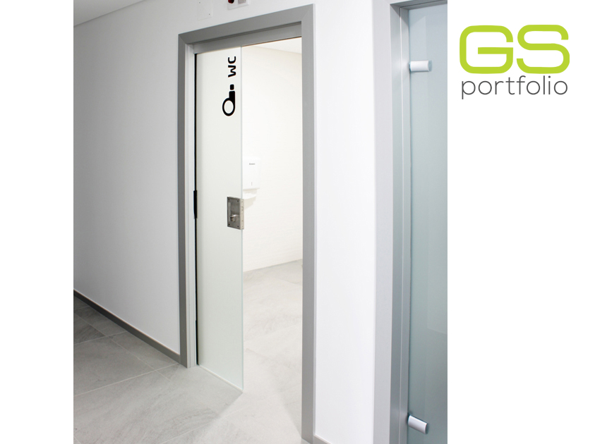 Contre-châssis pour portes à galandage – UNICO. Porte en verre blanc mat avec habillage et bandeau cache-rail en aluminium. By OPENSPACE!