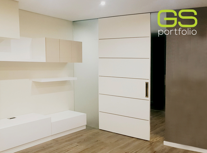 Deux portes avec 5 rainures, une vitre fixe et une autre porte coulissante en bois laqué blanc mat.