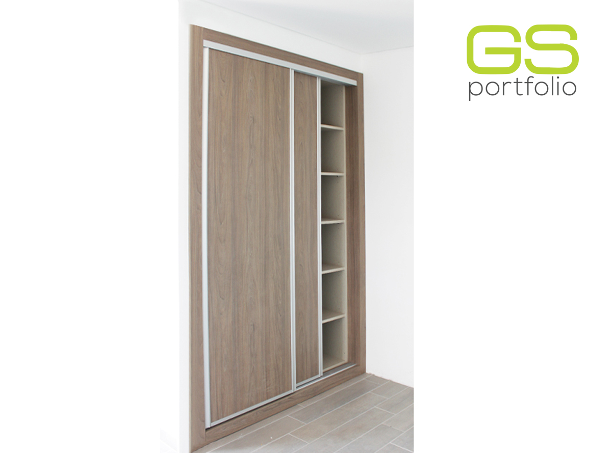 - Placard encastrée GS CONCEPT avec 2 portes coulissantes. Feuille de vinyle : Olmo Gris et profil latéral poignée en aluminium.